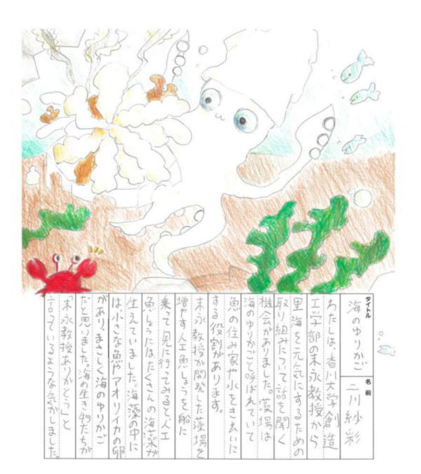 絵日記には、香川大学で末永PLと体験した藻場学習や船に乗った体験学習の様子が記され、アオリイカの産卵の様子が色鮮やかに描かれています。藻場の大切さをしかっりと理解し、楽しんでいただけたことが伝わる作品です。