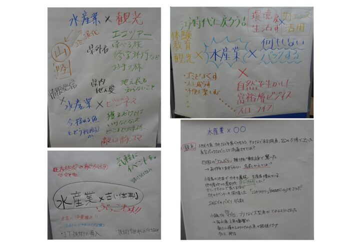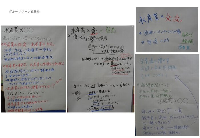 後半のグループワークでは、「水産業 × ○○ = ?」をテーマに、分野横断にて瀬戸内海の未来像と具体的なアクションについて議論しました。